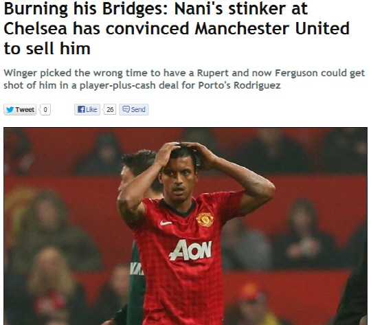 6일(한국시각) 영국 일간지 데일리미러에 따르면 알렉스 퍼거슨 감독은 지난 첼시와의 FA컵 경기에서 부진한 모습을 보인 나니의 경기력을 보고 그를 이적시키는 편이 낫다는 확신한 것으로 알려졌다. 맨유와 나니는 시즌 내내 재계약 협상을 했지만 진척은 없었고, 결국 협상결렬로 마무리되는 분위기다.