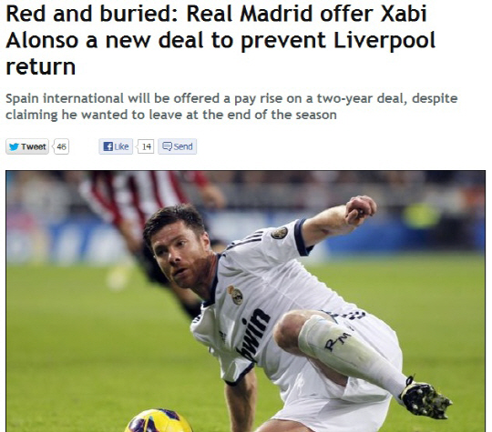 7일(한국시각) 영국 주간지 선데이피플은 레알 마드리드가 알론소의 리버풀 복귀를 막기 위해 2년 연장 계약을 제시할 것이라고 보도했다. 리버풀은 올시즌 후 알론소를 복귀시킬 계획을 세웠다. 브렌단 로저스 리버풀 감독도 이를 숨기지 않았다. 알론소 역시 리버풀 복귀에 대해 긍정적인 반응을 보였다.