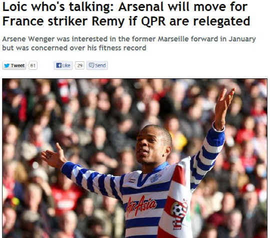 7일(한국시각) 영국 주간지 선데이피플은 아스널이 QPR이 강등될 경우 레미 영입전에 뛰어들 것이라고 보도했다. QPR은 강등시 레미의 이적료로 600만파운드를 책정했다고 선데이피플이 전했다. 아스널은 올 1월이적시장에서도 레미 영입을 고려했지만, 그의 부상 경력을 고려해 큰 돈을 쓰는 것에 대해 꺼려했다. 800만파운드에 QPR유니폼을 입은 레미는 예상과 달리 곧바로 잉글랜드 프리미어리그에 적응하며 좋은 활약을 펼치고 있다.