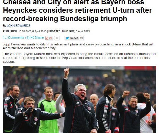 하인케스 감독은 올시즌을 끝으로 은퇴를 선언했다. 바이에른 뮌헨은 호셉 과르디올라 감독을 후임자로 점찍은 상황이다. 그러나 올시즌 바이에른 뮌헨을 이끌고 분데스리가 역사상 최단기간 우승을 확정지은 하인케스 감독을 두고 빅클럽들이 러브콜을 보내고 있다. 9일(한국시각) 영국 일간지 데일리메일은 첼시와 맨시티가 하인케스 감독 영입을 두고 고심하고 있다고 보도했다. 첼시는 조제 뮤리뉴 감독이 파리생제르맹으로 갈 경우를 대비해, 맨시티는 로베르토 만시니 감독의 후계자로 하인케스 감독을 염두에 두고 있다.