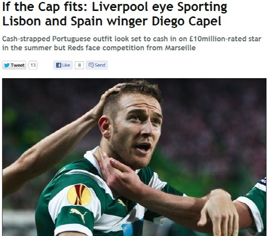 9일(한국시각) 영국 일간지 데일리미러는 리버풀이 스포르팅 리스본의 윙어 디에고 카펠에 관심을 보이고 있다고 보도했다. 2011년 스포르팅 리스본 유니폼을 입은 카펠은 윙어의 천국으로 불리는 포르투갈 리그에서도 최고의 윙어로 평가받고 있다. 올여름 더 큰 무대로 이적을 원하는 카펠의 몸값은 1000만파운드로 추정된다.