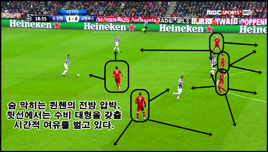 절정에 다다른 압박을 펼쳐 보였으니 유베로서도 어쩔 도리가 없었다는 생각이다. 가장 큰 문제는 기본적인 볼 소유를 제대로 할 수 없었다는 것. 시즌 평균 86%의 패스 성공률을 보였던 이 팀이 뮌헨을 상대하면서 기록한 성공률은 78%에 그쳤을 만큼 패스의 맥이 도중에 끊기는 경우가 많았다. 곳곳에서 상대 압박이 옥죄어 오는 동안에도 부폰은 지독하리만치 플랫 3에 짧은 패스 연결을 시도했는데, 이 볼은 후방에서 경기를 만들어나가야 했던 피를로에게 연결되기조차 쉽지 않았다. 그뿐만 아니라 연결된 다음에도 만주키치-뮐러-구스타보-슈바인슈타이거가 형성한 일종의 블록에 갇혀버린 피를로의 발끝은 살아나질 못했다.