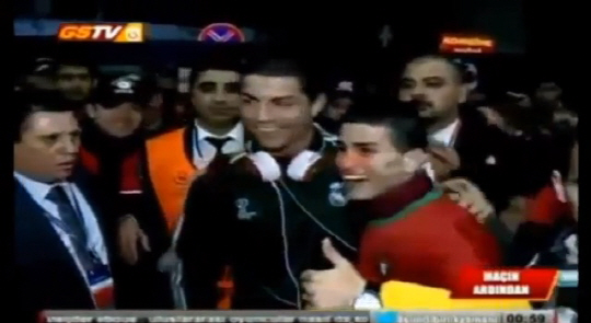 경기가 끝난 뒤 호날두가 팀 버스에 탑승하려고 할 때 재미난 광경이 연출됐다. 호날두가 버스 탑승을 잠깐 미루고 갑자기 방향을 바꾸더니 경호원 속에 한 남성 팬을 불러냈다.