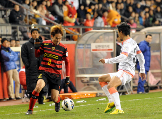 | ◇황진성이 10일 포항 스틸야드에서 열린 히로시마와의 2013년 ACL G조 4차전에서 드리블 하고 있다. 사진제공=포항 스틸러스 |