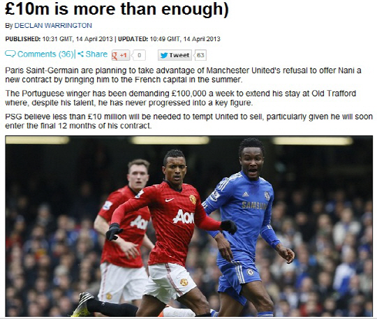맨유는 2007년 나니를 영입하기 위해 2000만파운드를 투자했다. 조금의 이적료라도 벌기위해서는 지금이 적기이다. PSG는 바로 이를 노려 나니를 싸게 영입할 계획을 세웠다. 나니는 스페인 진출을 원하고 있지만 맨유는 조금이라도 이적료를 더 줄 수 있는 구단으로 넘기겠다는 입장이다.