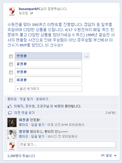 올시즌 본격적으로 승강제가 도입됐다. 새로운 팬들이 유입됐다. 부산은 이번 퀴즈 이벤트로 새로운 팬들에게 K-리그의 역사를 전하고, 올드 팬들에게는 아련한 추억을 전달하겠다는 계획이다.