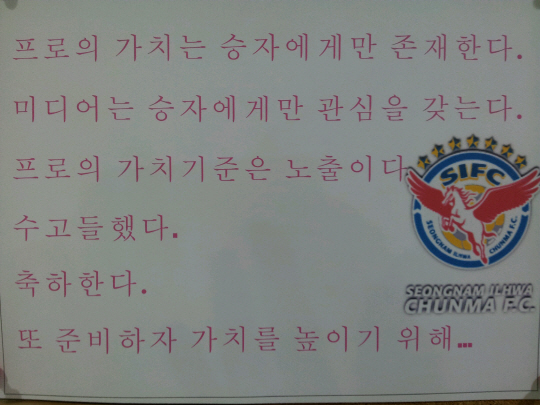 안익수 성남 감독은 선수들에게 말을 많이 하지 않는다. 가끔씩 슬쩍 흘리듯 던지는 농담이나 볼을 꼬집는 식의 스킨십이 애정 표현이다. 공식석상에선 잘 웃지도 않는다. 훈련장, 비디오 분석시간 외에는 선수들과 따로 접할 시간이 많지 않다. 물론 게으름을 피우거나, 나태하고 무신경한 플레이에는 지체없이 서슬퍼런 불호령이 떨어진다. 그야말로 '호랑이선생님'이다. 잘하는 선수, 마음에 드는 선수일수록 더욱 말을 아낀다. 언제나 '매의 눈'으로 관찰할 뿐이다. 진짜 하고 싶은 속이야기는 숙소 내 게시판에 글로 쓴다. 안 감독의 편지는 매주 업데이트된다. 부산 사령탑 시절부터 클럽하우스 내 게시판을 '소통의 도구' 삼았다.