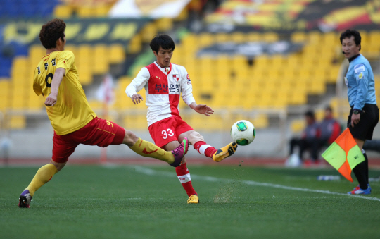 장학영은 올시즌 마수걸이 골을 17일 수원전에서 쏘아 올렸다. 1-1로 맞서던 후반 32분 결승골을 터뜨렸다. 장학영은 왼발잡이지만, 오른발이 빛났다. 이날 골은 장학영에게 평생 잊지 못할 골로 기억될 듯하다. 부산=김진회 기자 manu35@sportschosun.com