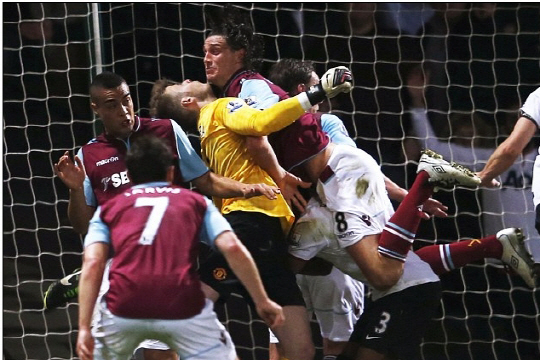 경기가 끝난 뒤 양팀 감독은 주심의 오심에 화를 냈다. 알렉스 퍼거슨 맨유 감독이 먼저 뿔이 났다. 전반 추가시간에 발생한 장면때문이었다. 왼쪽에서 올라온 코너킥을 맨유 골키퍼 데 헤아가 한 손으로 선방할 때 웨스트햄의 스트라이커 앤디 캐롤이 반칙을 범했다. 문전으로 달려들어가던 힘을 주체하지 못하고 데 헤아와 헤딩으로 볼을 걷어내려던 맨유 수비수 파트리스 에브라와 심하게 충돌했다. 데 헤아와 에브라는 그라운드에 한 동안 쓰러져 고통을 호소했다.