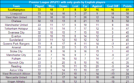 올 시즌 우승이 확실시 되고 있는 맨체스터 유나이티드는 4위로 처졌다. 팀 득점 5위 안에 잉글랜드 선수는 웨인 루니(12골) 밖에 없다.