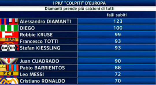 메시와 호날두는 72회와 70회의 파울을 당해 30위권 밖에 랭크되면서 예상 밖으로 물리적인 견제를 덜 받은 것으로 나타났다. 아니면 그들의 외계인급 실력이 파울조차 무력하게 만들었을지 모른다. <스포츠조선닷컴>