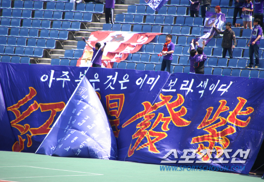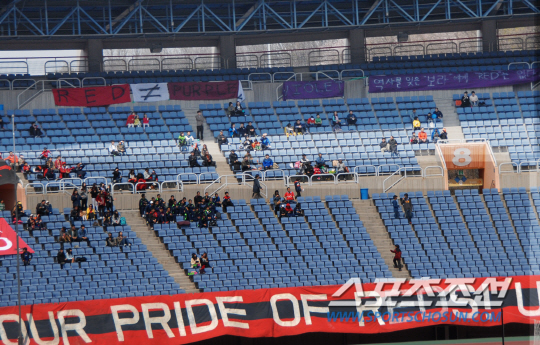 반대편 남쪽 구역에 자리를 잡은 안양 서포터 A.S.U. 레드는 자신들의 자리에 'RED ZONE(레드 존)'이라고 써붙였다. 메인 걸개에는 '아주 붉은 것은 이미 보라색이다'는 글귀를 새겼다. 같은 뜻의 '홍득발자(紅得發紫)'라는 사자성어도 넣었다. 안양 구단은 '보라색'을 메인 컬러로 설정했지만 서포터들은 안양LG 시절부터 써오던 '레드'를 모토로 삼았다.