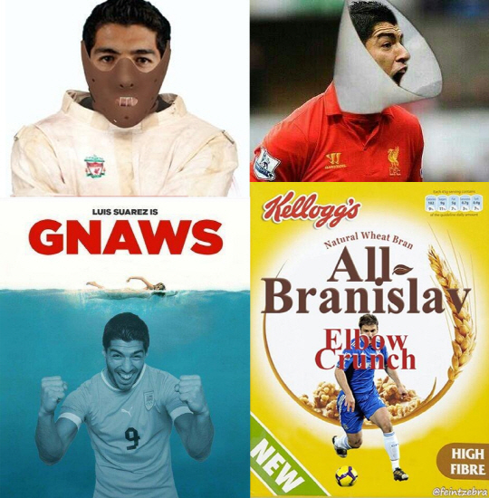 리버풀 '악동' 루이스 수아레스가 경기 중 상대 선수의 팔을 물어 큰 화제가 되고 있는 가운데, 수아레스의 행동을 풍자한 합성 사진도 SNS 상에서 봇물을 이루고 있다.