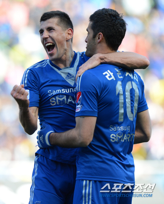 시즌 첫 슈퍼매치가 펼쳐졌다! 수원과 서울의 2013 K리그 클래식 경기가 14일 수원월드컵경기장에서 열렸다. 후반 수원 라돈치치가 강력한 헤딩으로 동점골을 터뜨리고 스테보와 기쁨을 나누고 있다. 수원=허상욱 기자 wook@sportschosun.com/2013.04.14/