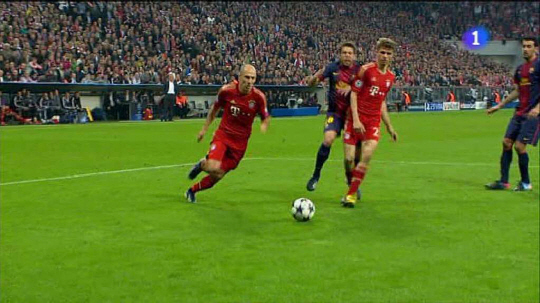 | 로번의 세번째 득점 직전 뮌헨 뮐러가 로번을 마크하던 알바에게 고의로 충돌하는 장면. | |
