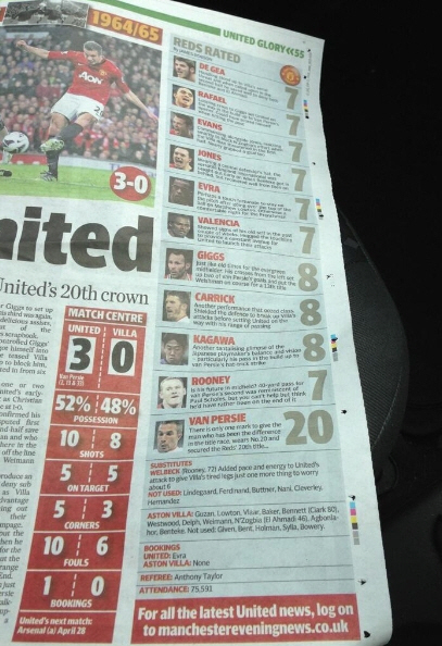 맨체스터 지역 유력지가 맨체스터 유나이티드 선수들의 평점을 매기면서 에이스 로빈 반 페르시에게 20점을 주는 기염(?)을 토했다.