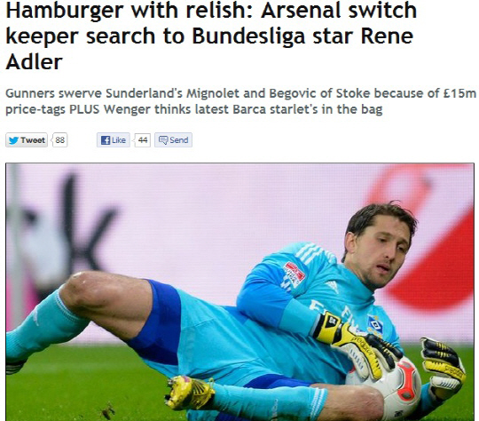 결국 아스널은 타깃을 바꿨다. 25일(한국시각) 영국 일간지 데일리미러에 따르면 아르센 벵거 감독은 독일 함부르크의 주전 골키퍼 레네 아들러를 지켜보고 있다고 보도했다. 손흥민의 동료인 아들러는 올시즌 초반 맹활약을 펼치며 다시 독일 대표팀에 승선되기도 했다. 벵거 감독은 이미 아들러를 관찰하기 위해 여러차례 스카우트를 파견한 것으로 알려졌다. 아스널은 예전 옌스 레만이라는 독일 출신 골키퍼를 영입해 재미를 본 바 있다. 아들러의 몸값은 500만파운드로 평가돼 재정면에서도 큰 부담은 없다.