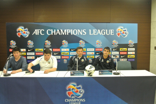 ◇미르잘랄 카시모프 분요드코르 감독(오른쪽 두 번째)이 29일 경북 포항의 포스코 국제관에서 열린 포항과의 2013년 ACL G조 최종전 기자회견에서 질문에 답하고 있다. 사진제공=한국프로축구연맹
