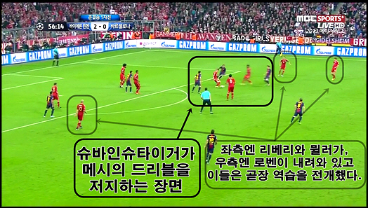 바르샤가 앞으로 나오려 할 때, 뮌헨이 보인 움직임을 되돌아보자. 기존에 뮌헨을 상대한 팀들은 앞선에서부터 형성된 숨 막히는 수비 블럭에 상당히 고전했는데, 이에 반해 바르샤는 해당 지점을 통과해 전진하는 데 어느 정도는 성공했다. 그런데 그다음이 문제였다. 슈바인슈타이거-하비 마르티네즈 라인이 단테-보아텡 중앙 수비 라인 앞을 견고히 둘러쌌음은 물론, 위에서부터 부지런히 내려온 공격진도 공간을 좁혀 바르샤를 가두었다. 로벤은 알바의 전진에 꾸준히 제동을 걸었고, 최전방 고메즈도 부지런히 뛰며 메시를 견제했으며, 리베리는 아예 페널티박스까지 내려와 알베스를 겨냥한 롱패스를 머리로 걷어냈기까지 했다. 뮐러 역시 공이 컸음은 물론, 이러한 공격진들의 수비 가담은 두 팀의 가로채기 개수(뮌헨 19 vs 바르샤 7)에서도 명확히 드러난다.