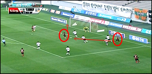 물론 측면을 택한 만큼, 중앙에서는 계속해서 균열이 생기곤 했다. 특히 데얀과 몰리나가 부지런히 중앙 미드필더-수비 사이 공간으로 움직이며 그 좁은 공간에서 연계 플레이를 만들어낼 수 있는 서울 공격진에게 이는 좋은 먹잇감이 됐을 것이다. 그러던 중 골 라인 끝까지 접근한 상대 윙어들이 낮고 빠른 크로스를 제공하는 장면에서 중앙의 공간을 충실히 메우질 못해 몇몇 위기를 초래했으며, 또한 중앙 수비 앞 공간에서 하대성과 데얀에게 중거리 슈팅을 고스란히 내주기도 했다. 그럴 때마다 박호진의 기가 막힌 선방과 너나 할 것 없이 육탄 방어에 동참한 수비라인, 그리고 약간의 운이 작용하면서 시간은 계속 흘러갔다.
