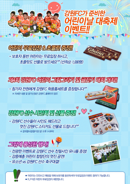 강원은 내달 5일 강릉종합운동장에서 갖는 대전 시티즌과의 2013년 K-리그 클래식 10라운드에서 어린이 무료입장 및 초콜렛 증정, 팬사인회, 마스코트 스티커 증정, 그림그리기 및 글짓기 대회 등을 연다. 그림그리기 및 글짓기 대회는 경기 당일 전광판을 통해 발표하는 주제에 맞춰 솜씨를 자랑하면 된다. 유아 및 초등생이라면 누구나 참가할 수 있으며, 참가 어린이 전원에게 강원 구단 문구세트가 선물로 주어진다. 도화지와 원고지는 대회 현장에서 배부되며 도구는 개인 지참이다. 그림그리기 대회의 경우 사용 도구를 크레파스와 파스텔로 제한했다. 안전사고 예방을 위해 참가 어린이는 반드시 보호자가 동반하는 것을 원칙으로 정했다. 시상은 12일 강릉종합운동장에서 열릴 성남 일화와의 클래식 11라운드에서 열린다. 참가신청은 강원 구단 홈페이지(http://www.gangwon-fc.com)에서 가능하며, 당일 현장 접수도 가능하다. 경기시작 1시간 전까지 매표소 옆 안내데스크에서 참가확인 및 도화지(원고지)를 수령하면 된다.
