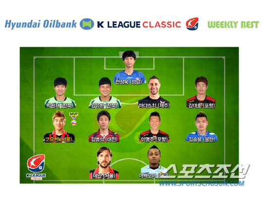 프로연맹은 MVP와 함께 '주간 베스트 11(4-4-2)'도 공개했다. 투톱에는 고요한의 도움을 결승골로 연결한 데얀(서울)과 대구의 아사모아가 이름을 올렸다. 최고의 미드필더에는 고요한을 비롯해 김승용(울산) 이명주(포항) 김병석(대전)이 선정됐다. 김대호(포항) 마다스치(제주) 임유환 박원재(이상 전북)가 최고의 수비, 전상욱(성남)은 이번 라운드에서 가장 뛰어난 선방을 펼친 골키퍼로 뽑혔다.