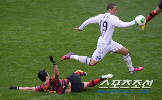 ◇지난 6일 오후 포항 스틸야드에서 열린 포항-인천 간의 2013년 K-리그 클래식 경기에서 인천 디오고(오른쪽)가 포항 박희철의 패스를 피해 드리블 하고 있다. 포항= 김경민 기자 kyungmin@sportschosun.com