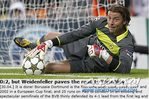 도르트문트는 1996~1997시즌 챔피언스리그우승 후 16년 만에 정상에 도전하게 됐다. 바이에른 뮌헨이 1차전에서 바르셀로나를 4대0으로 꺾으며 유리한 고지를 확보해놓은 상태다. 분데스리가 1-2위간 맞대결이 성사될 가능성도 높다. 유럽챔피언스리그 결승전은 25일 런던 웸블리스타디움에서 펼쳐진다.