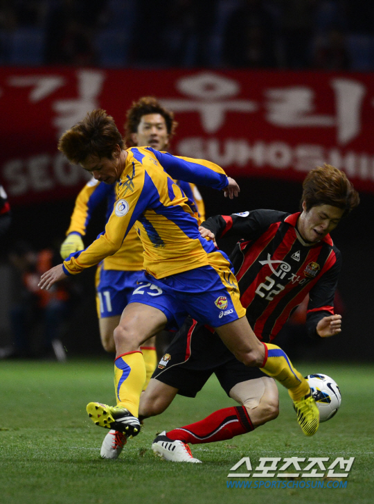 | ◇서울 고명진(오른쪽)이 지난달 10일 일본 미야기현 센다이 스타디움에서 열린 2013년 ACL 본선 조별리그 E조 4차전에서 센다이 스가이를 제치고 드리블 하고 있다. 센다이(일본)=사진공동취재단 |