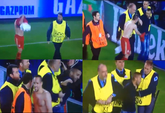 그러자 리베리가 갑자기 유니폼 상의를 벗더니 끌려나가는 그를 따라가 팔 사이로 유니폼을 구겨넣는 성의를 보였다.