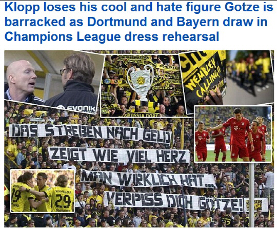 '괴체'와 '회네스'라는 뜨거운 감자로 두 팀의 대결은 더 뜨거워졌다. 도르트문트 팬들의 사랑을 듬뿍 받았던 괴체는 유럽챔피언스리그 준결승 2차전을 앞두고 전격적으로 바이에른 뮌헨행을 결정했다. 시즌 중 라이벌 팀으로 이적을 발표한 것에 대해 팬들은 분노했다. 하필이면 바이에른 뮌헨이 유럽챔피언스리그 결승전 상대로 결정되면서 괴체의 입장이 더욱 난감해졌다. 괴체는 결승 진출의 주역이 됐지만 팬들의 비난은 수그러들지 않았다. 이날 경기장 남쪽 스탠드에는 '돈만 보고 떠난 아이돌 꺼져라'라는 플래카드가 걸렸고, 일부 팬은 괴체의 유니폼에 'X'자 표시를 해 분노를 표출했다. 괴체는 이날 부상으로 경기에 나서지 못했다. 도르트문트 이슈의 중심에 괴체가 있었다면, 바이에른 뮌헨에는 회네스 회장이 있었다. 회네스는 세금 탈세 및 외환법 위반으로 독일 축구 영웅에서 역적으로 추락했다. 도르트문트 팬들에게는 좋은 먹잇감이었다. 그는 경기 내내 '돈만 밝히는 회장'이라는 비아냥을 들어야 했다. 그 시각 회네스 회장은 로번, 슈바인슈타이거와 농구 관람을 한 것으로 알려졌다.