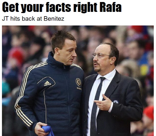 영국 언론들은 테리도 램파드와 같은 신세를 예상했다. 데일리메일은 벤치가 아닌 18명의 출전 명단에도 이름을 올리지 못할 것이라고 내다봤다. 테리는 최근 베니테스 감독 부임 이후 주전경쟁에서 밀렸다. 최근 3경기 연속 결장했다. 베니테스 감독은 테리 대신 개리 케이힐을 낙점했다.