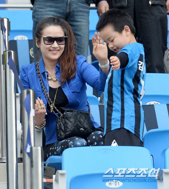 인천 유나이티드와 제주 유나이티드의 2013 K리그 클래식 11라운드 경기가 12일 인천축구전용경기장에서 열렸다. 경기장을 찾은 인천 김남일의 아내 김보민 아나운서와 아들 서우 군이 경기시작을 기다리고 있다. 인천=허상욱 기자 wook@sportschosun.com