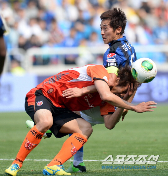인천 유나이티드와 제주 유나이티드의 2013 K리그 클래식 11라운드 경기가 12일 인천축구전용경기장에서 열렸다. 인천 김남일과 제주 박기동이 볼을 다투고 있다. 인천=허상욱 기자 wook@sportschosun.com/2013.05.12/