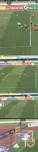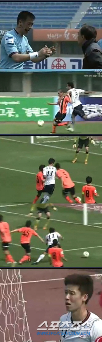전반 종료 직전 김동섭의 발리 슈팅은 골로 인정받지 못했다. 비디오 분석 결과 크로스바를 맞고 바닥으로 떨어진 공은 명백히 골라인을 넘었다. 당시 부심이 김동섭의 위치를 '온사이드'로 본 상황 판단은 옳았다. 그러나 이후, 가장 중요한 골라인 판정에서 세밀함이 부족했다. 부심의 위치에서 정확하게 보지 못했다. 이번엔 골을 도둑맞은 성남 벤치가 격렬히 항의했다.