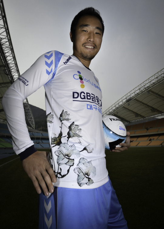 대구FC 이번 시즌 새 유니폼(홈 경기). 대구의 시화인 목련꽃이 상의 우측 부분에 프린팅돼 있다. 공격수 이진호가 선수가 대구스타디움에서 새 유니폼을 착용한 채 포즈를 취하고 있다.사진제공=대구FC