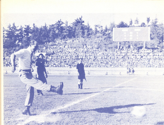 | ◇고 박태준 포스코 명예회장이 지난 1975년 9월 열린 신일본제철 초청 한-일 친선대회에서 시축하고 있다. 사진제공=포항 스틸러스 |