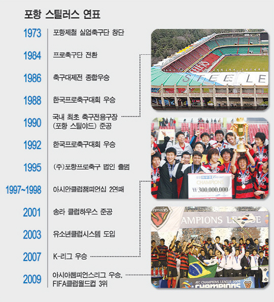 포항 스틸러스에겐 '전통의 명가'라는 수식어가 부끄럽지 않다. 실업 시절이던 1973년 포항제철 실업축구단으로 출발해 현재에 이르기까지 40년 역사가 숨쉬고 있다. 그간 포항 소속으로 태극마크를 단 선수만 60명이 넘는다. 스타의 산실 역할을 톡톡히 해왔다. 축구전용구장이라는 단어도 생소했던 1990년 포항 스틸야드를 준공한 것은 시작에 불과했다. 포항시 외곽 송라면에 대규모 연습구장을 겸비한 클럽하우스까지 구축하면서 프로축구 인프라 선진화에 앞장섰다. 모기업 포스코의 장학재단 산하 연령별 축구부는 유스시스템 조기 정착이라는 선물로 돌아왔다. 매년 준척급 인재들이 3~4명씩 나오면서 유럽과 비교해도 부끄럽지 않은 최고의 유스 시스템을 갖춘 팀이 됐다. 프로통산 4회 리그 우승, 3차례 아시아 정상 등극, 세계 3위(클럽월드컵)라는 성과는 그야말로 영광의 발자국이다. 초대 구단주이자 포스코 신화를 이끈 고 박태준 명예회장의 선견지명과 열정, 구단을 지탱해온 프런트와 선수 모두의 노력이 없었다면 불가능한 일이었다.