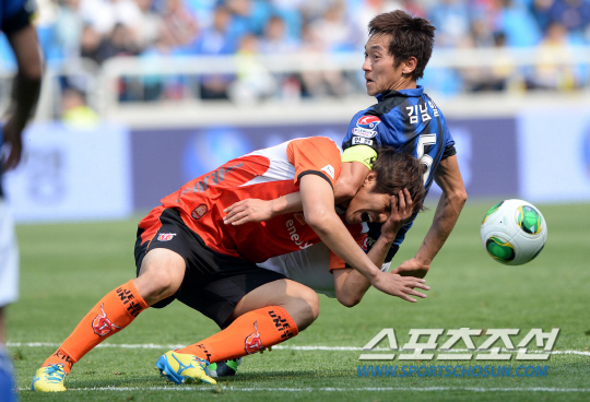 인천 유나이티드와 제주 유나이티드의 2013 K리그 클래식 11라운드 경기가 12일 인천축구전용경기장에서 열렸다. 인천 김남일과 제주 박기동이 볼을 다투고 있다. 인천=허상욱 기자 wook@sportschosun.com/2013.05.12/ |