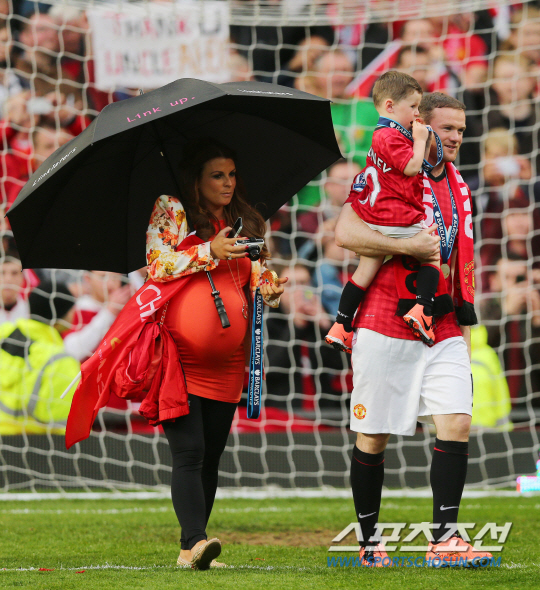 | 루니가 지난 13일 마지막 홈경기 직후 열린 맨유의 EPL 우승 축하 행사에 아내, 아들과 함께 그라운드를 걷고 있다. |