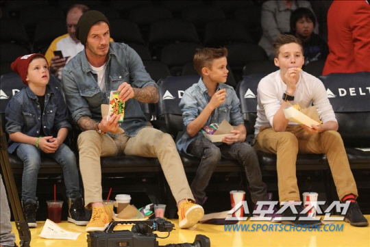 | LA갤럭시 시절이던 지난해 12월 세 아들 크루즈, 로미오, 브루클린과 함께 LA 스테이플스 센터를 찾아 농구를 관전하고 있는 베컴. |
