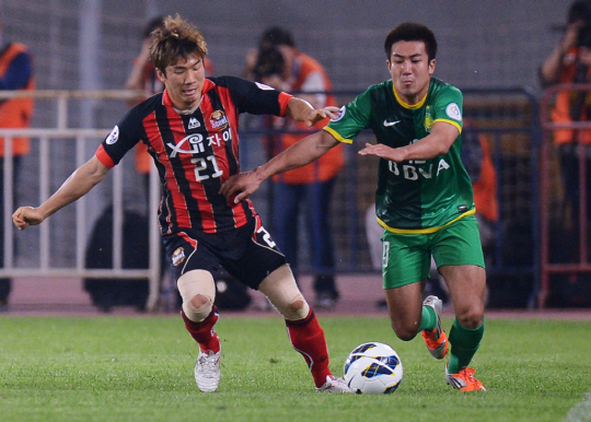 ◇14일 중국 베이징 에서 열린 2013 아시아챔피언스리그 16강 1차전 FC서울과 베이징 궈안의 경기에서 FC서울 고요한과 베이징 왕샤오링이 볼을 다투고 있다. 베이징=사진공동취재단
