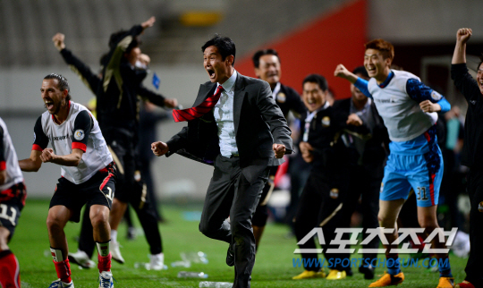 FC서울이 21일 오후 상암동 서울월드컵경기장에서 베이징 궈안과 아시아챔피언스리그(ACL) 16강 2차전을 펼쳤다. FC서울이 베이징궈안에 3대1 역전승을 거두며 8강에 진출했다. 종료 직전 고명진이 쇄기골을 성공시키자 환호하고 있는 최용수 감독과 FC서울 선수들. 상암동=송정헌 기자 songs@sportschosun.com/2013.5.21