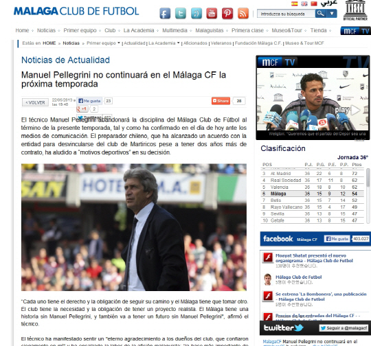 | 말라가가 페예그리니 감독과 이별을 발표했다. 사진캡처=말라가 홈페이지 |