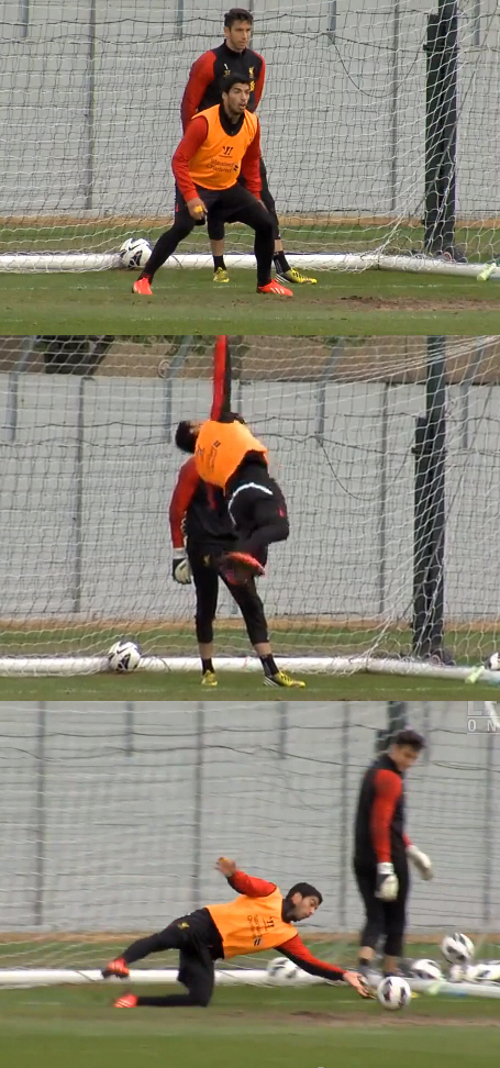 수아레스는 장갑도 끼지 않은 채 즉흥적으로 골키퍼 훈련에 임한 것으로 보인다.