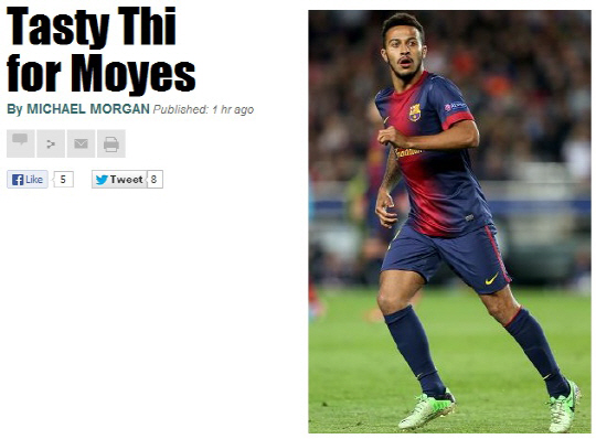 23일(한국시각) 영국 일간지 더선은 모예스 감독이 바르셀로나 미드필더 티아구 영입에 나섰다고 보도했다. 모예스 감독은 은퇴한 폴 스콜스의 후계자로 티아구가 적격이라는 판단을 했다. 더선에 따르면 맨유는 티아구의 이적료로 1500만파운드를 준비했다.