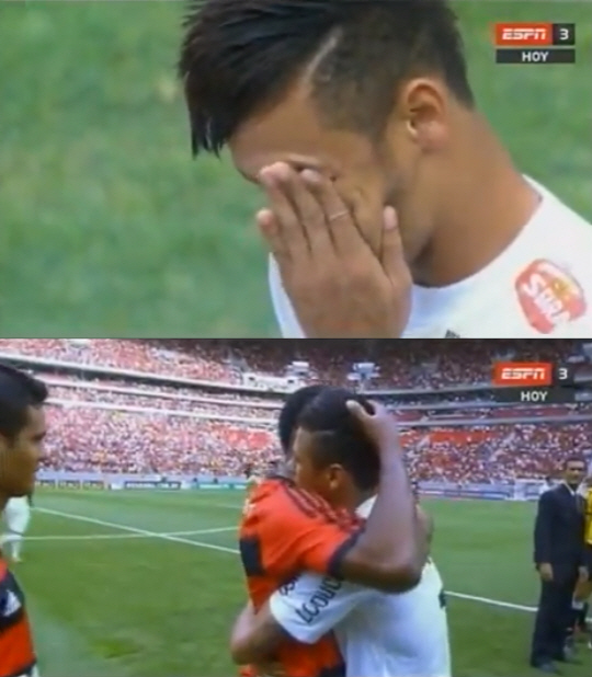원정경기였지만 남미 최고 스타인 네이마르에 대한 관중의 성원은 대단했다. 네이마르는 경기전 감정을 주체 못하고 눈물을 흘렸다. 상대 선수 한명 하명과도 격한 포옹을 나누며 브라질에서의 마지막 순간을 음미했다.