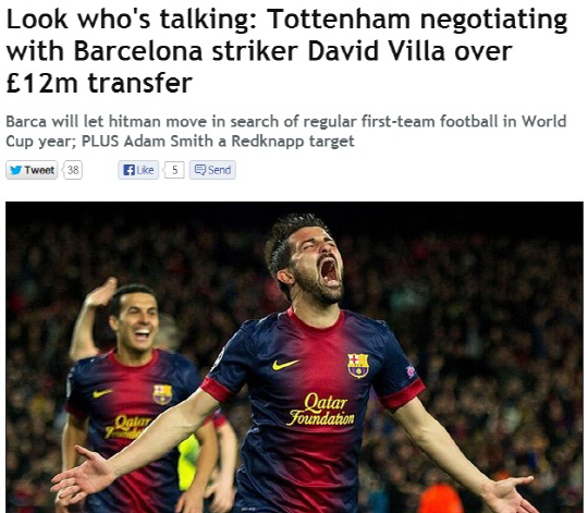 28일(한국시각) 영국 일간지 데일리미러는 안드레 비야스 보아스 토트넘 감독이 자신의 개인적 친분을 이용해 바르셀로나의 다비드 비야를 영입할 계획을 세웠다고 보도했다. 비야는 과거 아스널, 리버풀의 러브콜을 받았지만, 바르셀로나에 잔류했다. 그러나 비야는 2014년 브라질월드컵 출전을 원하고 있어, 더 많은 출전 기회를 갈망하고 있다. 네이마르 영입을 확정지은 바르셀로나 역시 1200만파운드 이적료만 맞춰준다면 비야를 보내겠다는 계획을 세웠다.