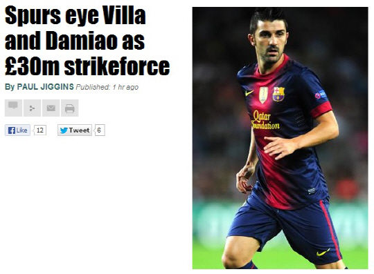 비야는 월드컵 출전을 위해 정기적인 출전기회를 원하고 있다. 바르셀로나 역시 네이마르 영입으로 포지션이 겹치는 비야의 방출을 고려하고 있다. 바르셀로나는 1200만파운드를 원하고 있지만, 토트넘의 제시액 1000만파운드를 두고 주판알을 튕기고 있다. 다미앙의 영입을 두고는 아틀레티코 마드리드와 경쟁을 펼치고 있지만, 토트넘의 의지가 더 커보인다. 과연 토트넘이 원하는데로 공격수 보강에 성공할 수 있을지. 토트넘의 여름은 벌써부터 뜨거워지고 있다.