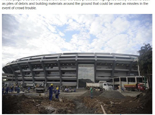 브라질과 잉글랜드의 친선경기가 경기장 안전문제로 연기됐다고 보도했다. 브라질 지역 법정은 월드컵 결승전이 치러질 마라카낭 경기장이 아직 완벽하지 않아 관중들이 위험할 수 있다면 경기 연기를 지시했다. 마라카낭 경기장은 무려 2억8600만파운드를 들여 7만9000석의 최신식 경기장으로 탈바꿈했다. 지난달 재오픈을 했지만, 아직 완벽한 모습을 보이지 못했다. 추가 기술 테스트마저 연기한 상태다.